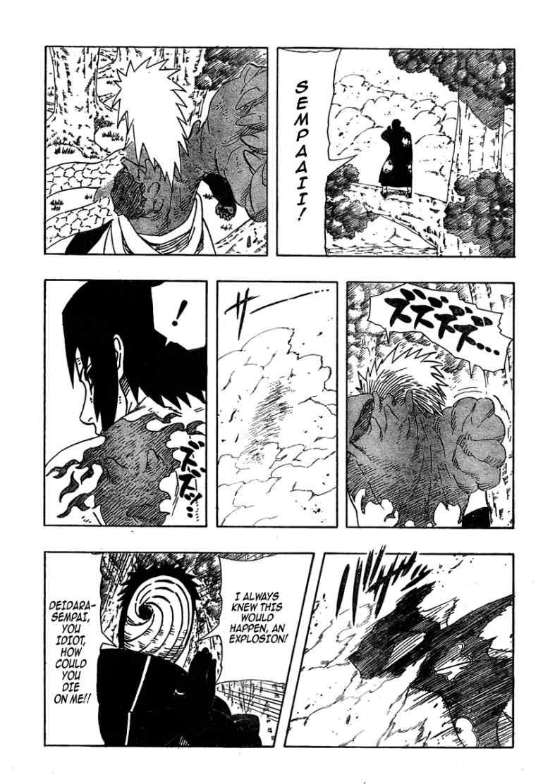 As the dragon falls Deidara uses his feet to pull out the shuriken. The dragon explodes so Sasuke uses snakes to pull himself away and his seal retreats. Tobi is sad but Deidara emerges from the dust on a bird with wounds on his arms. Deidara stares down at Sasuke and curses his eyes. We flashback to Sasori, Kisame and Itachi meeting Deidara for the first time. Deidara states he wants nothing to do with their group and Sasori states Deidara has spunk. Itachi explains that the leader wants Deidara's abilities and he in turn is surprised they know of them. Kisame states Deidara has worked for terrorist cells causing numerous explosions. Deidara states he had no reason for helping the terrorists outside of art. He makes a clay spider and states it's more than just the model, the moment it explodes it achieves its true beauty. Sasori and Kisame are annoyed by his ranting and Itachi activates Sharingan stating he'll take care of it.